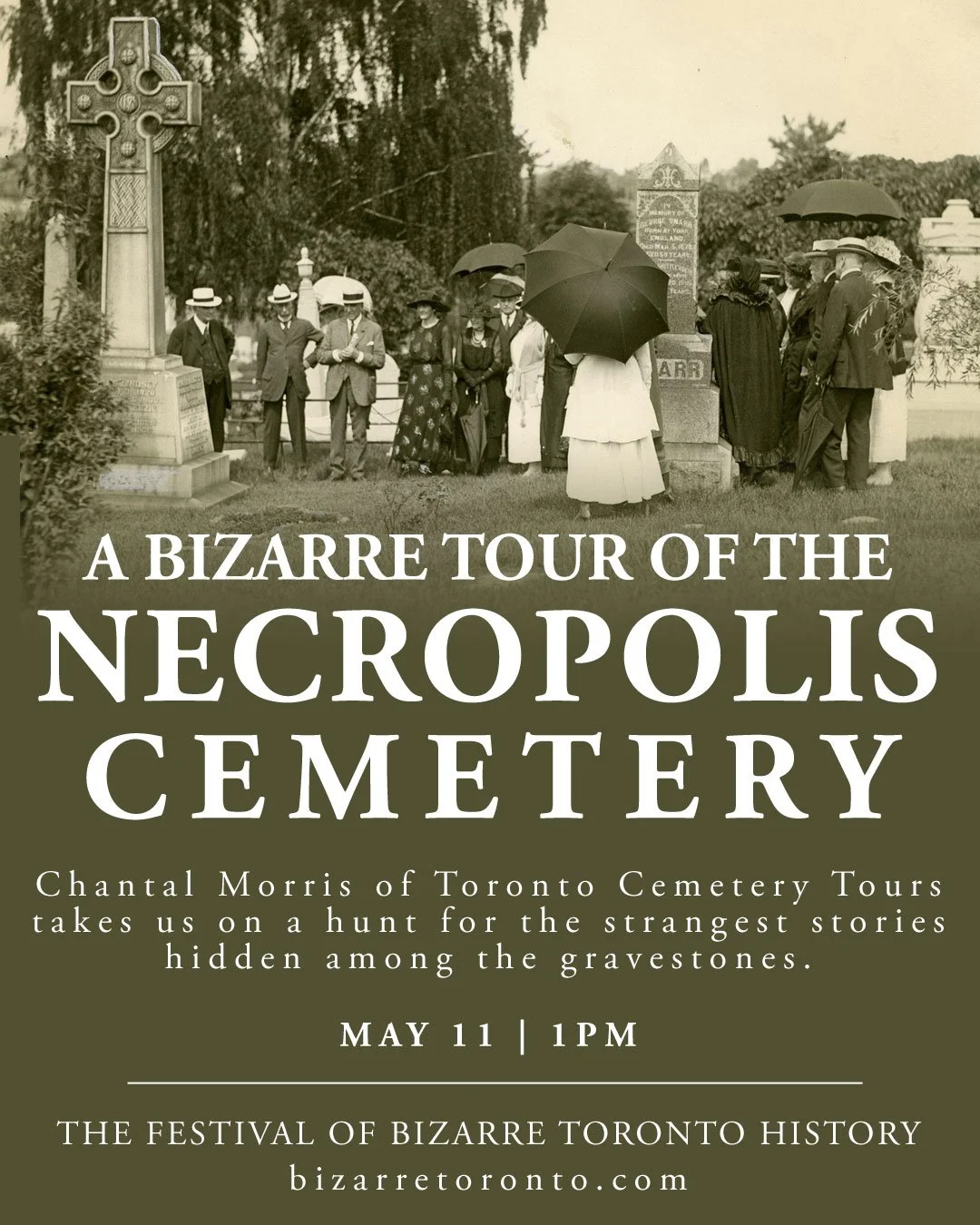 For a second year, Toronto Cemetery Tours will be participating in the Festival of Bizarre Toronto History. Join us on a hunt for the strangest stories hidden among the gravestones of the Toronto Necropolis Cemetery. Tickets for the entire festival or only the tour may be purchased at bizarretoronto.com .